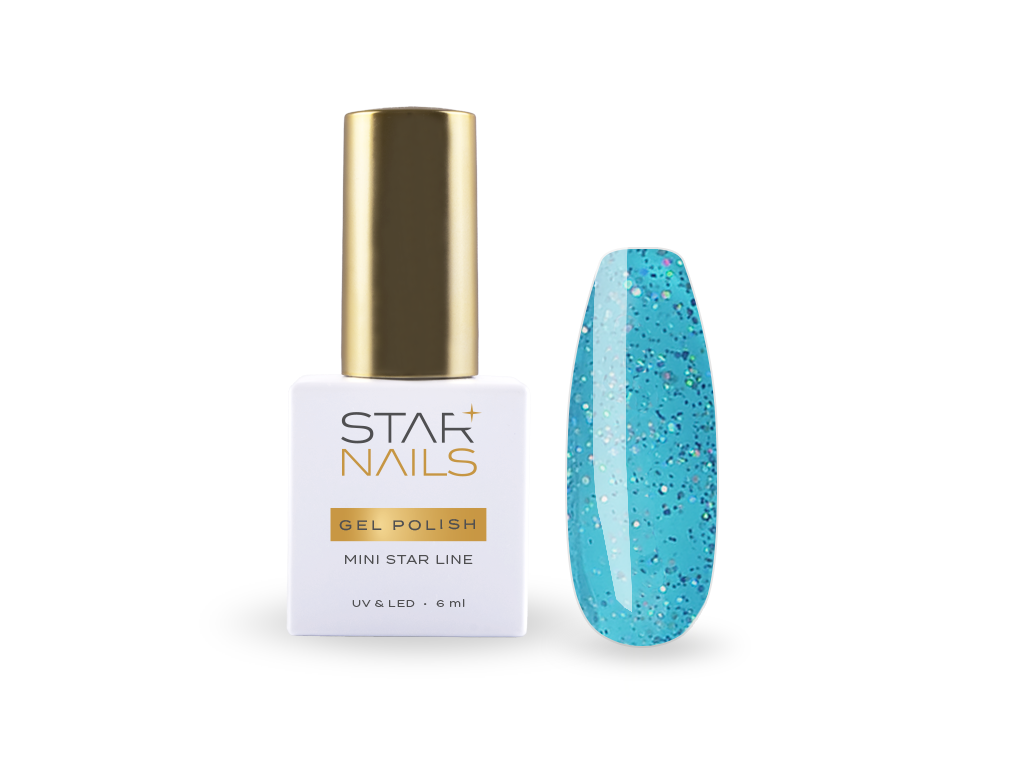 Gel lak vysoké kvality 067 - BUTMAN ze základní řady gel laků STARNAILS MINI STAR je první volbou nejen pro profesionální nehtové designéry. Vyznačuje se středně hustou konzistencí a vysokou krycí schopností už ve dvou vrstvách. Díky své samovyrovnávací schopnosti je vhodný i pro úplné začátečníky. Tyrkysově modrý základ gel laku doplňuje hustá koncentrace glitrů. V jedné vrstvě je gel lak polotransparentní.